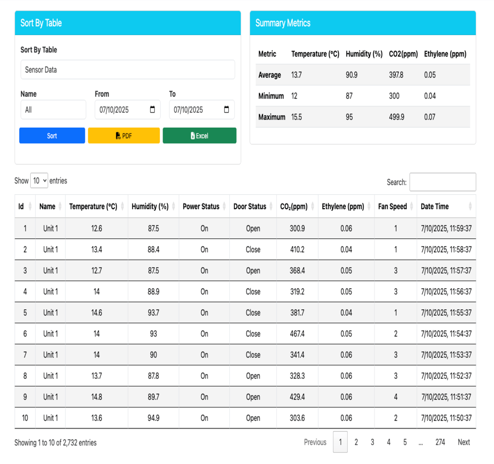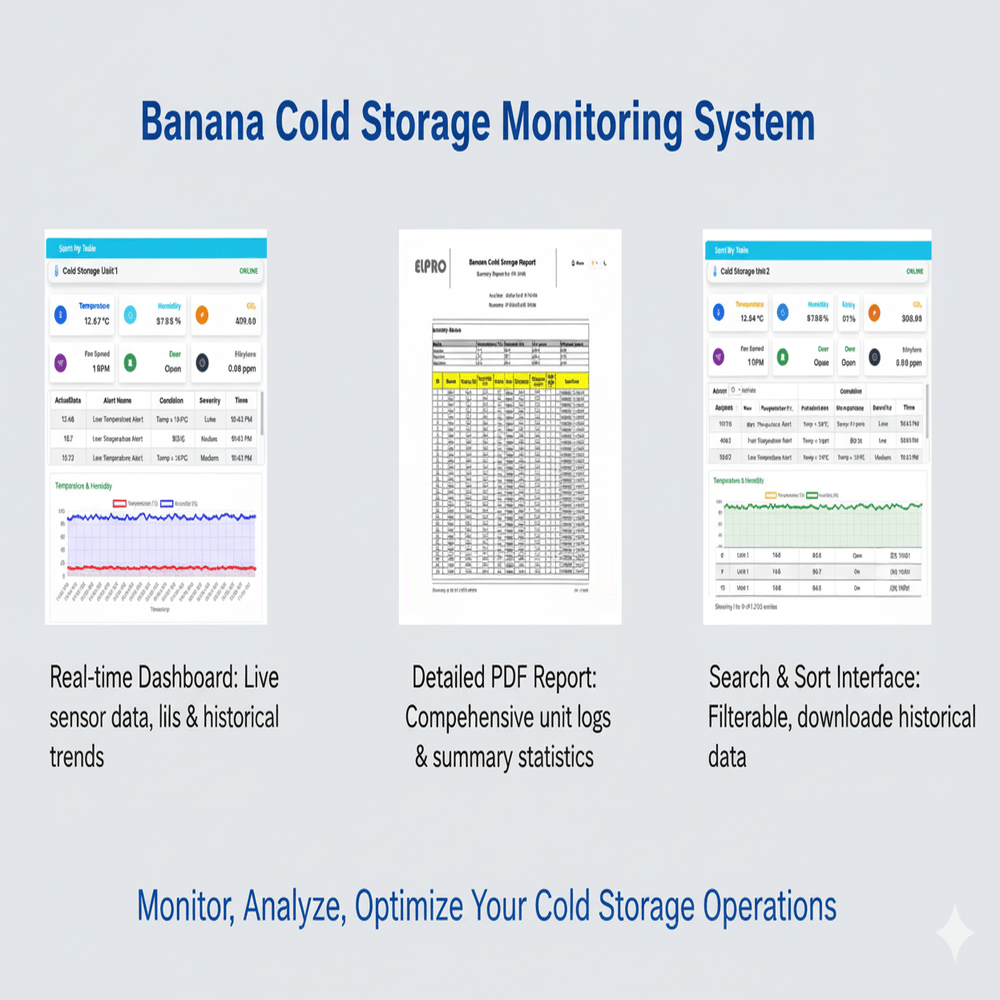 The Smart Banana Cold Storage system ensures optimal ripening conditions through real-time sensor integration and AI-based process control.