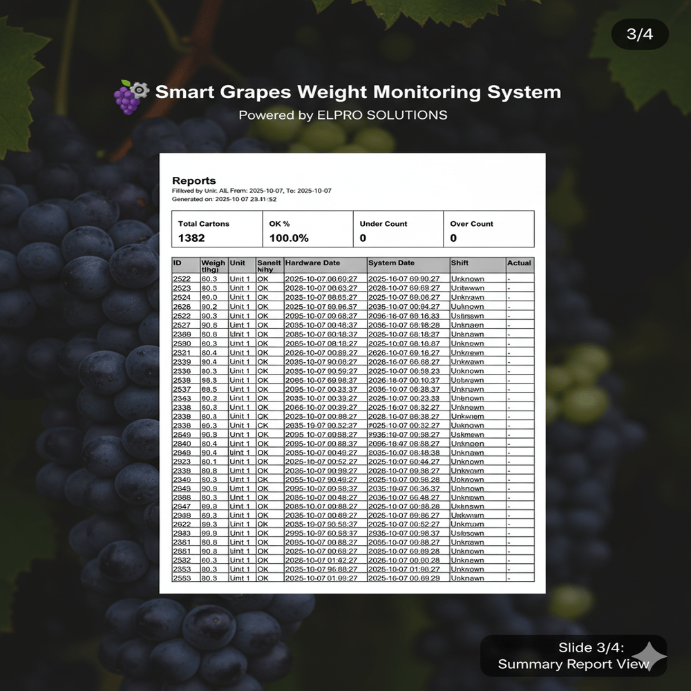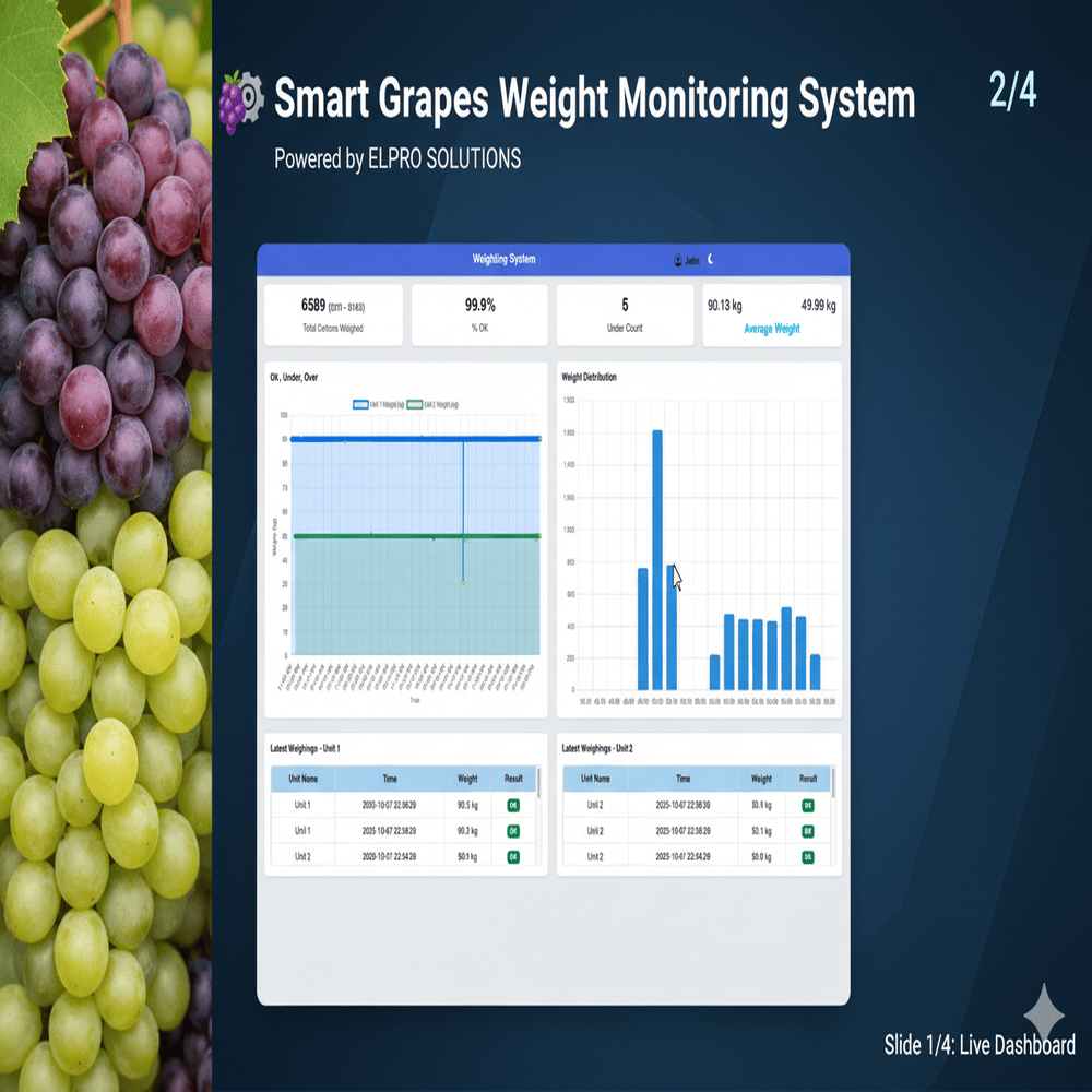 This system automates grape weighing and inspection using AI and industrial sensors.