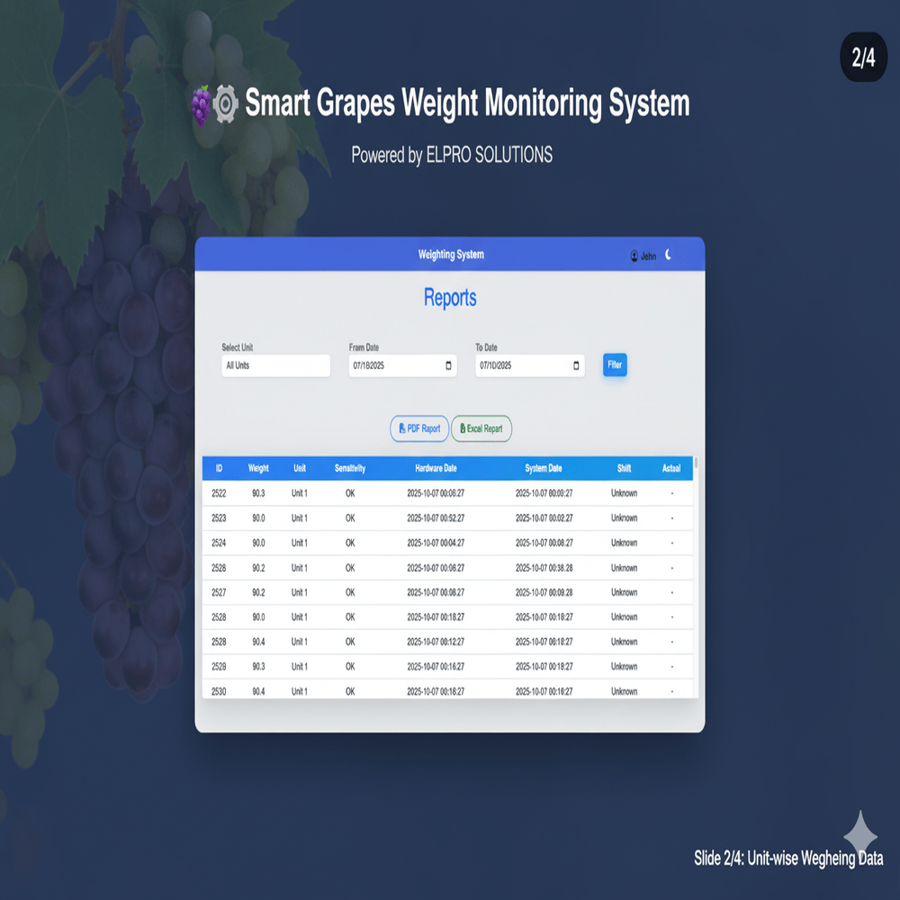 This system automates grape weighing and inspection using AI and industrial sensors.